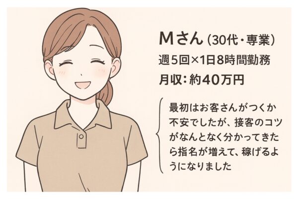 「最初はお客さんがつくか不安でしたが、接客のコツがなんとなく分かってきたら指名が増えて、稼げるようになりました」