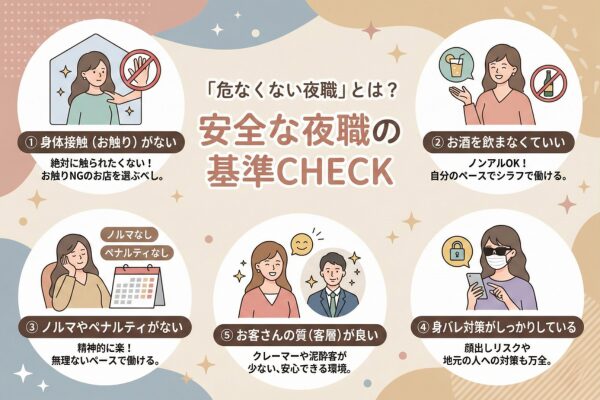 まずは、「安全な夜職」の一般的な基準を5つ紹介します。ここをクリアしているかが超重要です!