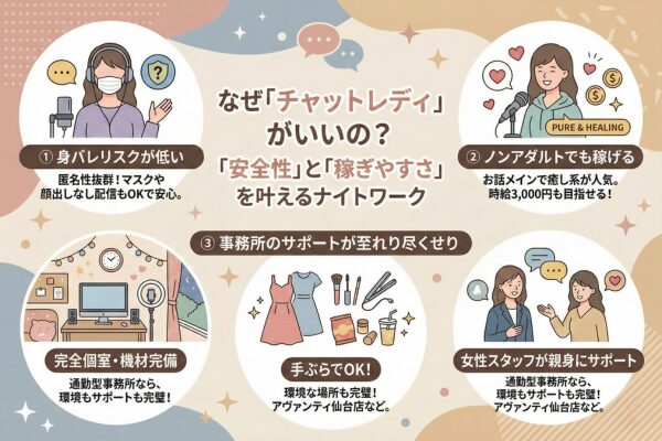 仙台にはたくさんのナイトワークがありますが、「身体接触なし」「身バレ対策あり」「自分のペースで働ける」という条件を満たしているのは、今のところチャットレディが一番強い選択肢だと言えます。